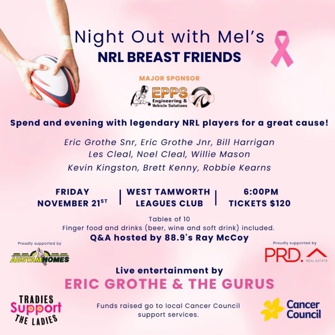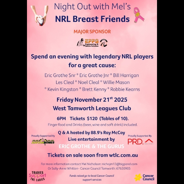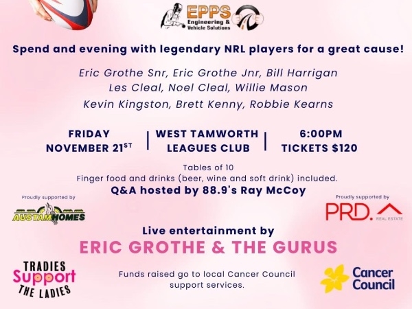 Join us for a glamourous evening at Wests with your favourite NRL legends, a delicious meal, auctions, raffles with great prizes, and entertainment by Eric Grothe and The Gurus.